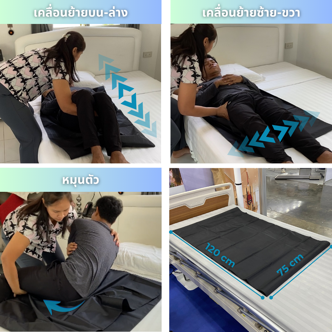 ผ้าช่วยเคลื่อนย้ายถูกออกแบบมาให้ผู้ดูแลสามารถจัดท่าหรือเคลื่อนย้ายผู้ป่วย ลดความเสี่ยงของผู้ดูแลในการยกหรือเคลื่อนย้ายผู้ป่วย รวมถึงช่วยป้องกันการเกิดแผลกดทับในผู้ป่วย
